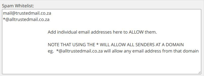 If you are getting a lot of spam emails, try setting the spam score settings to about 3 or 4. In extreme cases if you are getting lots of spam, try going to 2 or 3 but keep watch to make sure that legitimate emails are not being caught. You can whitelist important emails using the instruction in step 3 (above) then Mailscanner will not scan or block them.