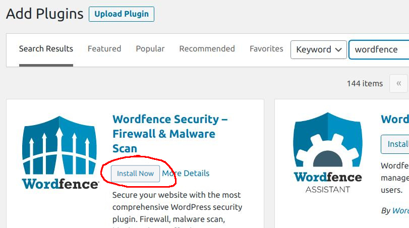 3. In the Search Plugin box, enter the name of the plugin you wish to install, such as WORDFENCE, then click on the Install button.